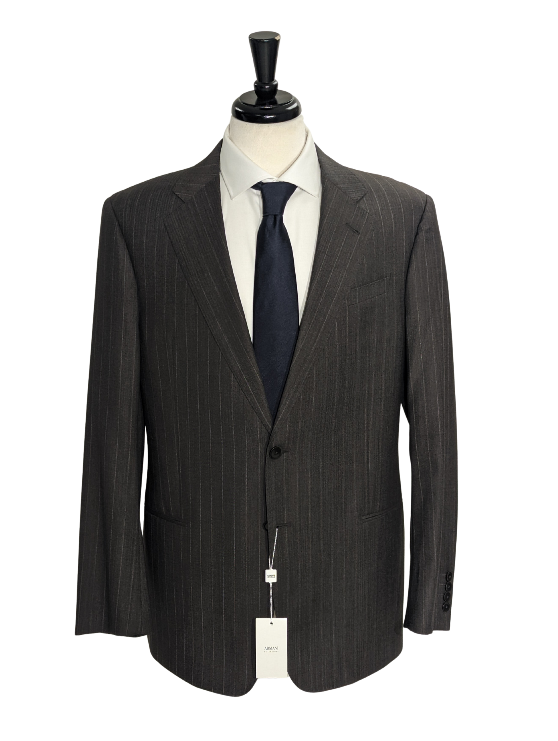 This Armani Collezioni suit is crafted from 100% wool in a refined charcoal tone with subtle pinstripes, offering a timeless and professional look. The fully canvassed, fully lined jacket features a two-button front, notch lapels, besom pockets, and dual side vents for a clean, structured silhouette. Matching flat-front trousers are unhemmed and ready for tailoring. A versatile choice for business or formal occasions.
