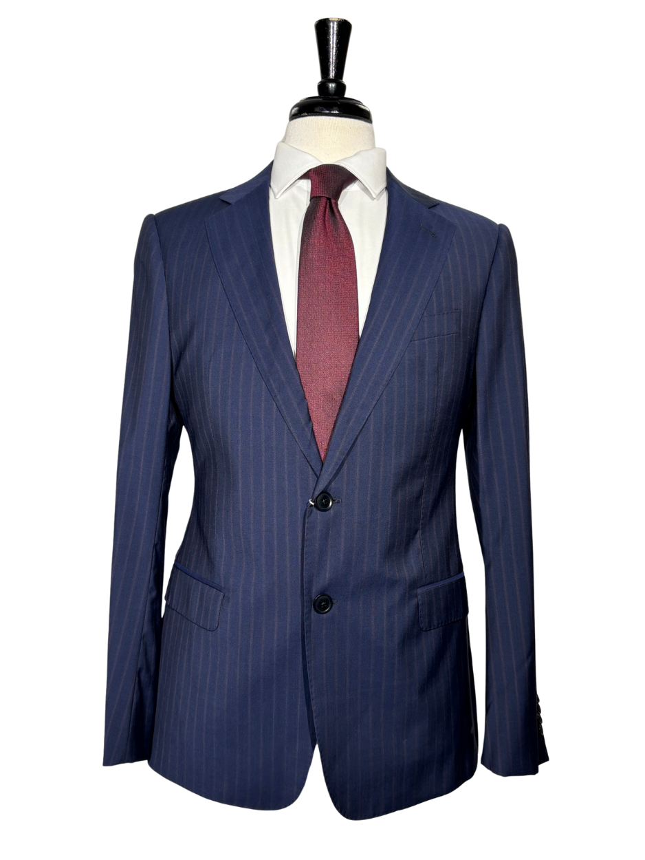 This Armani Collezioni blue with burgundy pinstriped suit blends classic tailoring with modern elegance. It features a notch lapel, two-button closure, and dual vents for comfort and style. A sharp choice for business or formal wear.