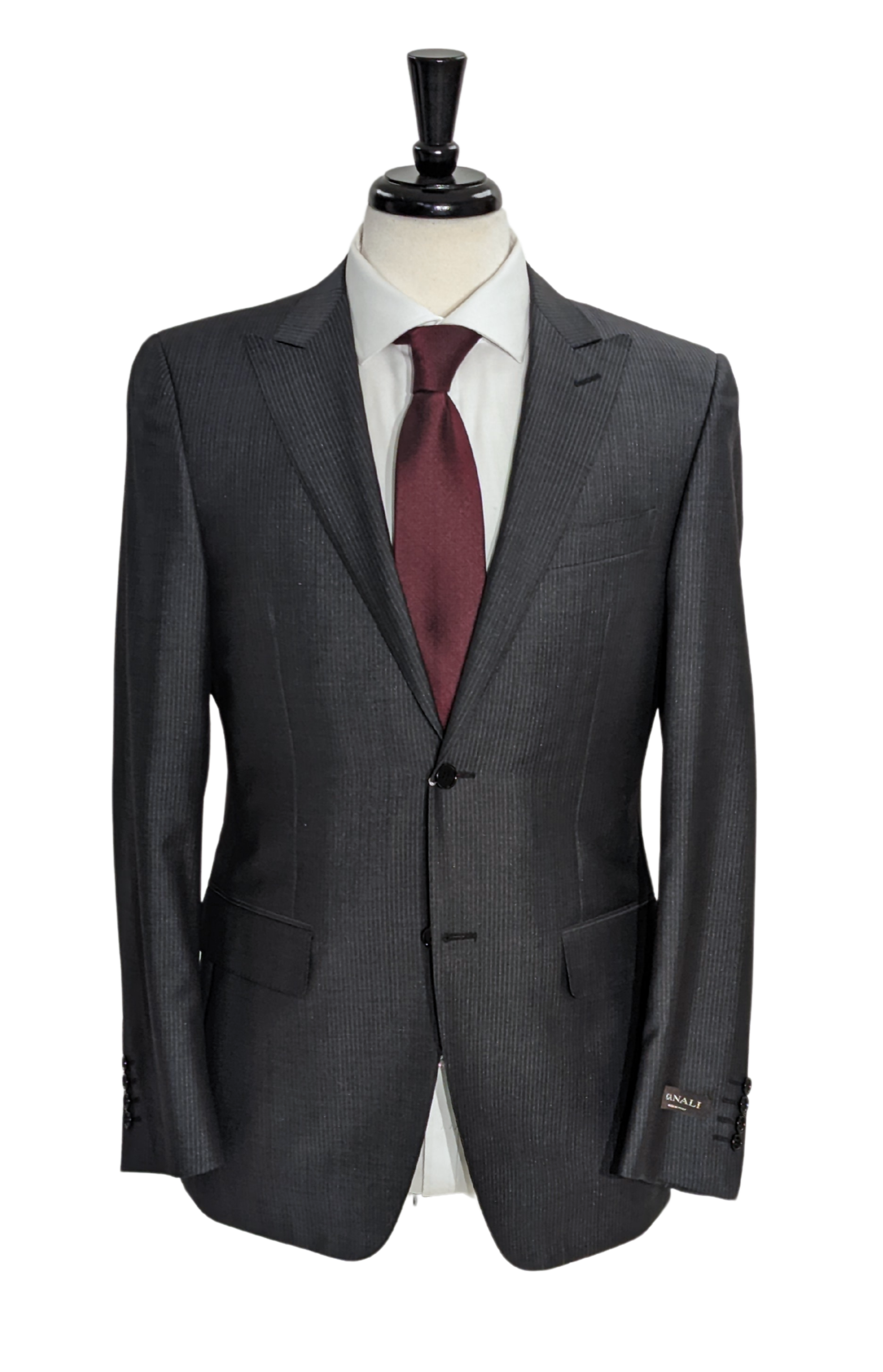 This Canali gray pinstripe suit is a bold, refined statement piece, tailored in Italy from a premium wool blend for structured drape and subtle sheen. The classic gray base is accented with clean vertical pinstripes, lending the suit timeless authority. The fully-canvassed jacket is styled with sharp peak lapels and a single rear vent for a confident silhouette and ease of movement. Fully lined for comfort, the jacket features a two-button front and tailored shape. Paired with flat-front trousers, this suit delivers a sophisticated profile ideal for boardroom presentations, formal events, or standout businesswear.
