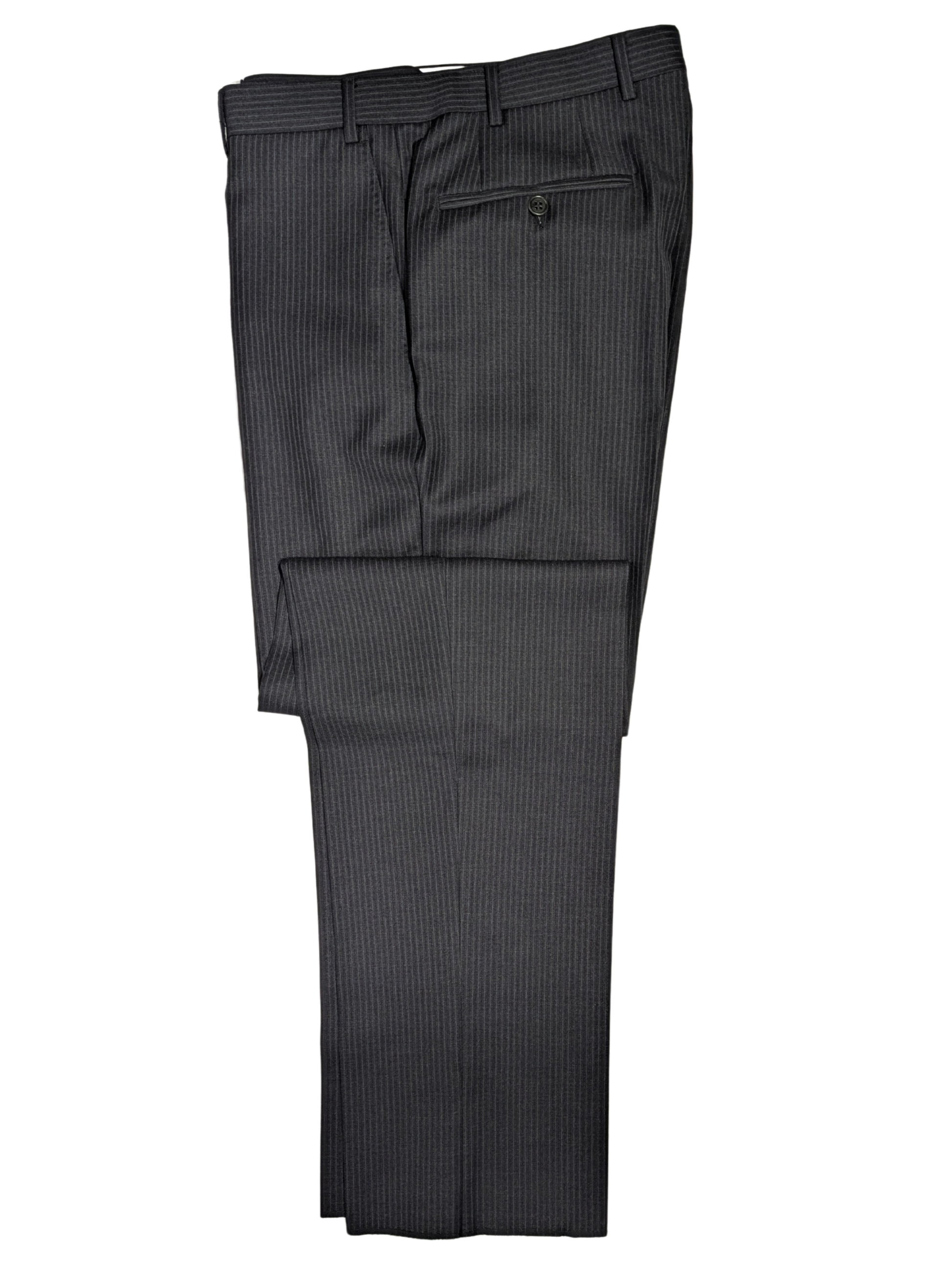 This Canali charcoal pinstripe wool suit offers refined Italian tailoring with a timeless business-class silhouette. The fabric features a soft gray base enhanced by subtle, evenly spaced pinstripes, adding dimension without bold contrast. Crafted from premium wool, the fully-canvassed jacket ensures long-lasting shape and structure, complemented by full lining and dual side vents for all-day comfort. Designed with a two-button front and notch lapels, this suit includes flat-front trousers for a clean, modern profile. A smart investment for professionals and anyone seeking classic style with elevated details.