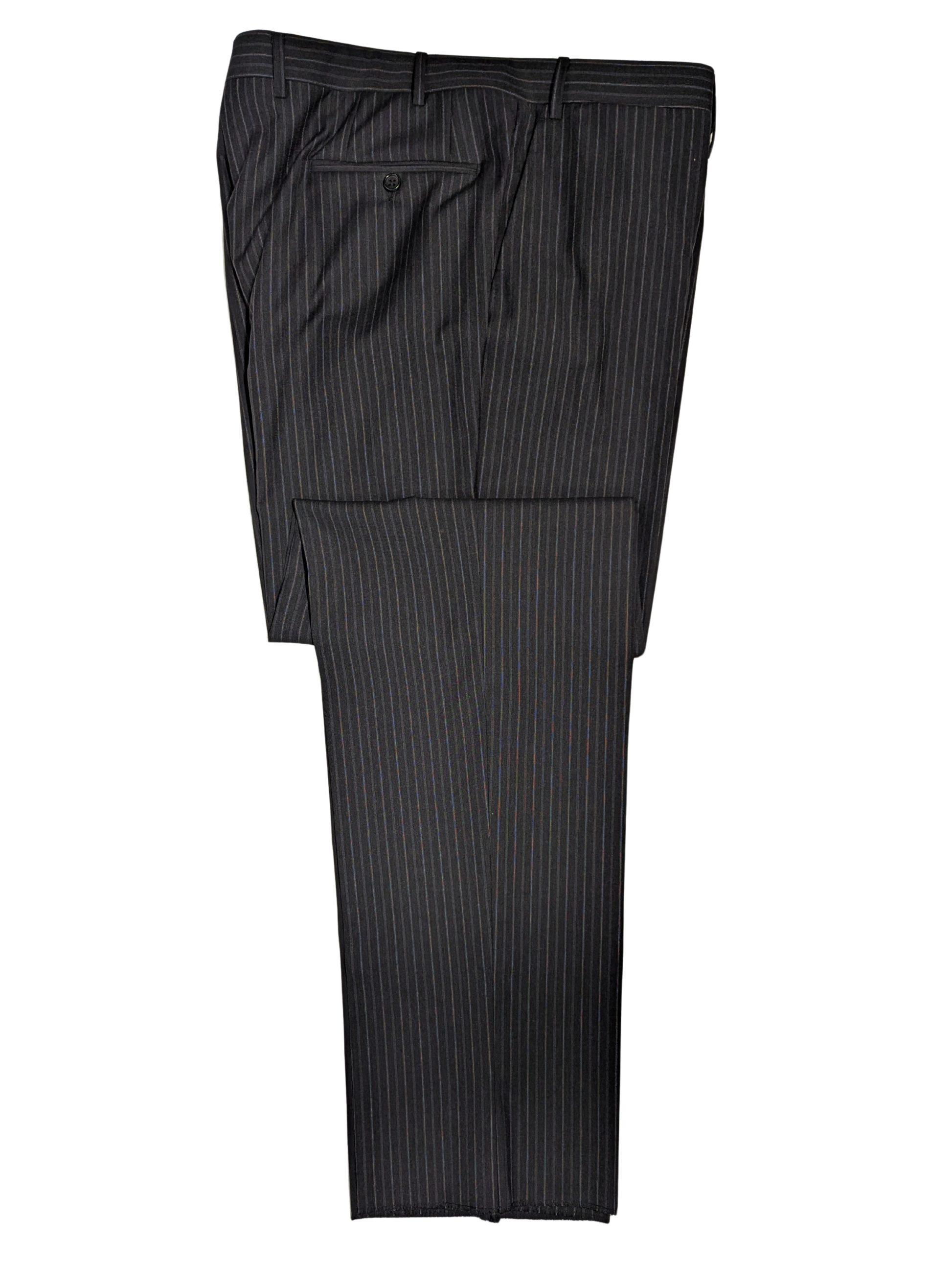 This Canali charcoal pinstripe suit is a distinguished choice for business or formal dressing, crafted in Italy from 100% wool. The charcoal fabric is accentuated by evenly spaced pinstripes, delivering a crisp, confident look that stands the test of time. The fully-canvassed jacket offers superior structure and drape, with full lining, a three-button front, notch lapels, and dual side vents for a tailored yet comfortable fit. Paired with flat-front trousers, this suit is a staple of refined menswear — balancing traditional style with Canali’s signature Italian craftsmanship.