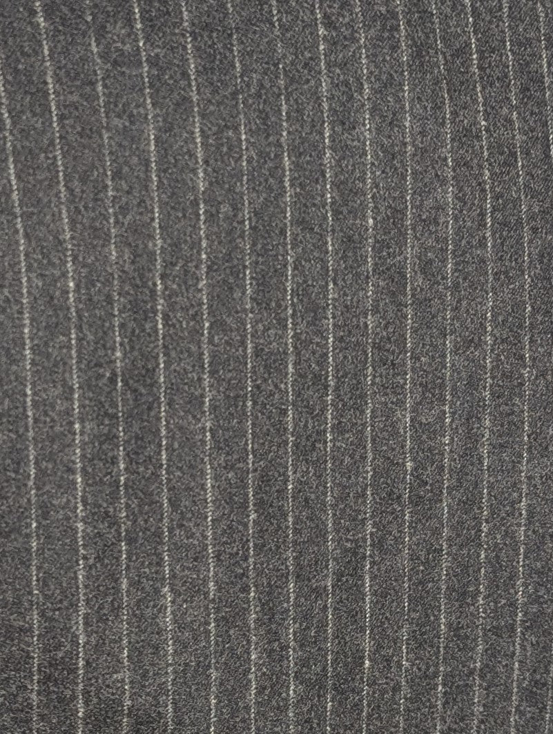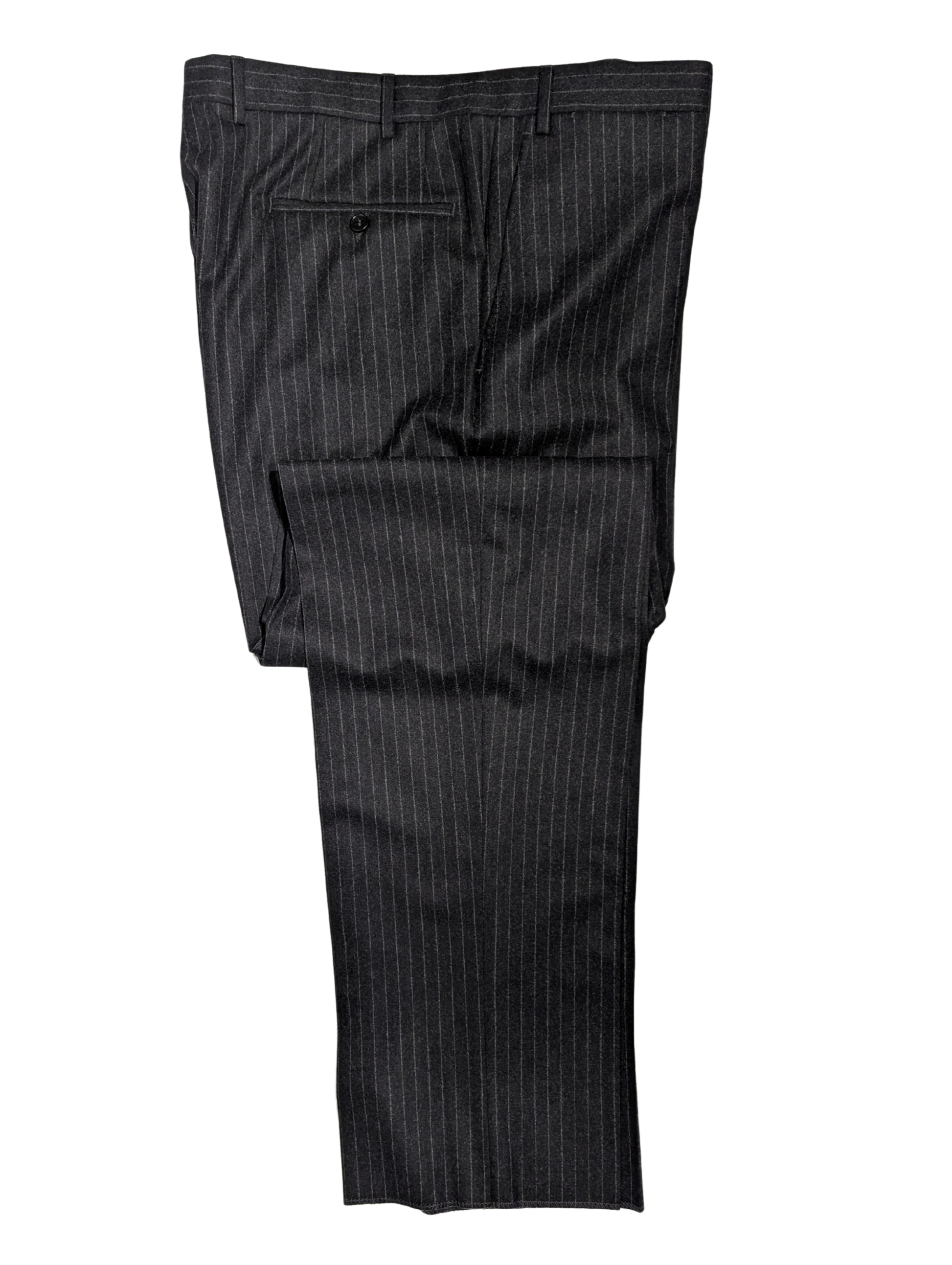 This Canali suit is tailored from a rich charcoal wool flannel with a soft, brushed finish that offers warmth and texture—ideal for cooler seasons. It features elegant white pinstripes that lend a classic business aesthetic with a sharp vertical profile. The jacket is styled with a notch lapel, two-button closure, and dual side vents, delivering timeless structure and comfort. The matching trousers are cut with a flat front for a clean, modern silhouette. A distinguished choice for professionals and style connoisseurs alike, this Canali piece exemplifies quality craftsmanship and enduring style.