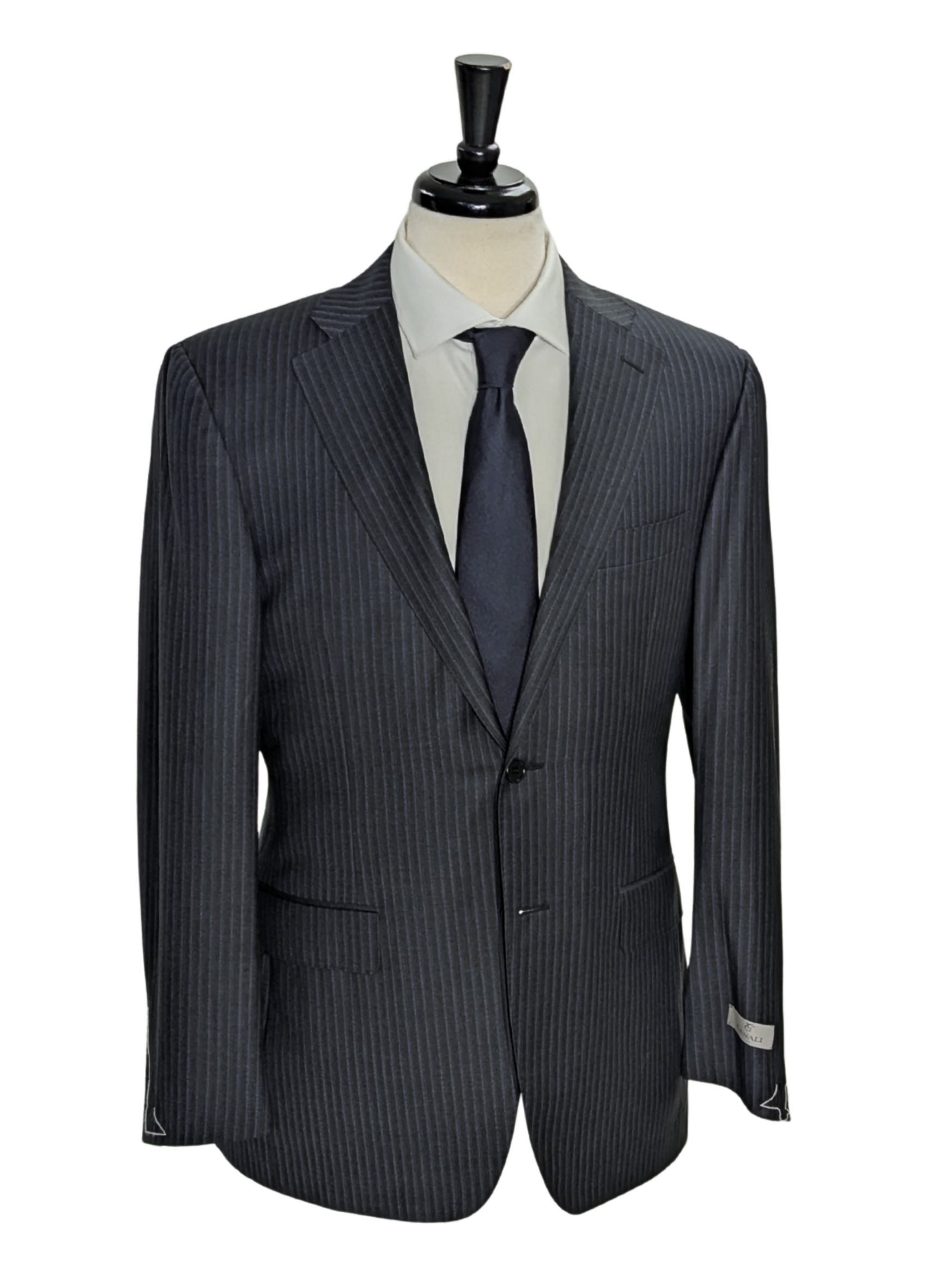 Elevate your wardrobe with this Canali charcoal striped suit, featuring a subtle yet refined tonal stripe pattern. The premium 100% wool fabric offers a soft hand and smooth finish, while the pinstripes provide depth and visual interest in an understated manner. Designed for the discerning gentleman, the jacket is fully canvassed for a structured fit and long-lasting shape. The classic two-button front, notch lapels, and dual side vents combine for a modern, tailored silhouette. Paired with flat-front trousers, this suit is ideal for any business setting, formal event, or sophisticated evening affair. Crafted in Italy, this suit reflects Canali’s commitment to timeless style and impeccable craftsmanship.