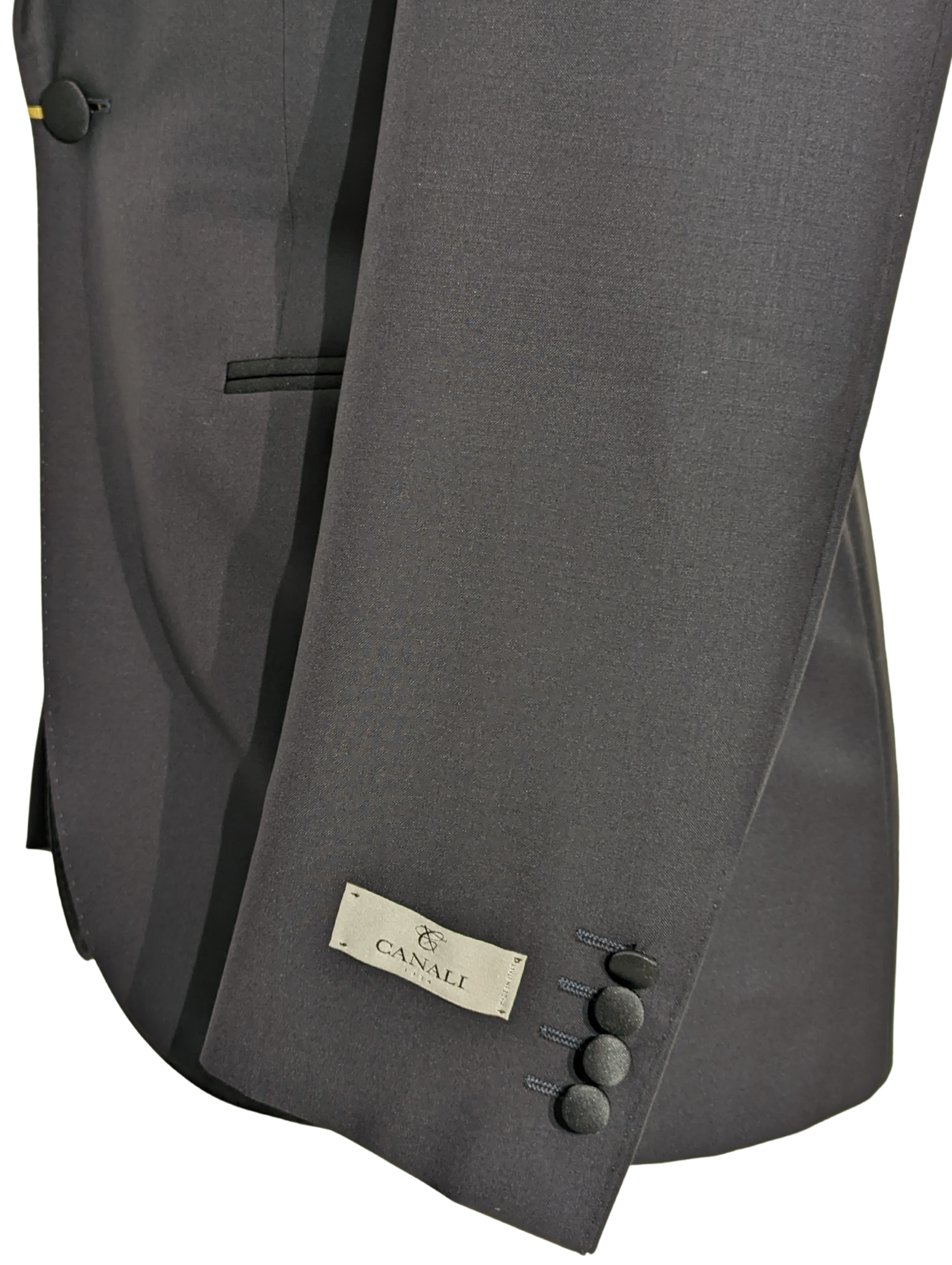 This Canali navy tuxedo blends modern elegance with timeless craftsmanship. Made from a premium wool-mohair blend, it features a sleek one-button closure, satin-trimmed shawl lapel, and satin-covered buttons for a polished finish. The matching flat-front trousers complete the formal look, making it an ideal choice for weddings, galas, and black-tie affairs.