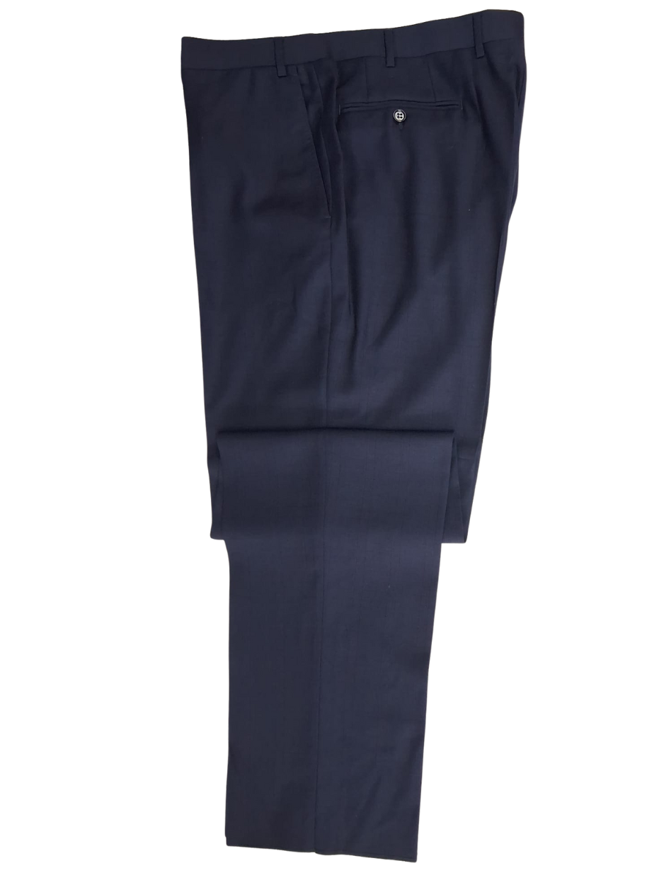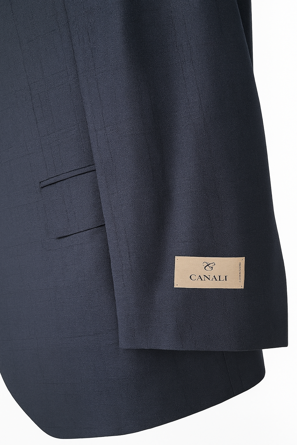 This Canali navy blue windowpane pattern suit is crafted from 100% wool. It features a notch lapel, two-button front, and side vents for comfort and mobility. The windowpane pattern adds depth without overpowering, making it ideal for both business and formal wear. This suit reflects timeless Italian tailoring.