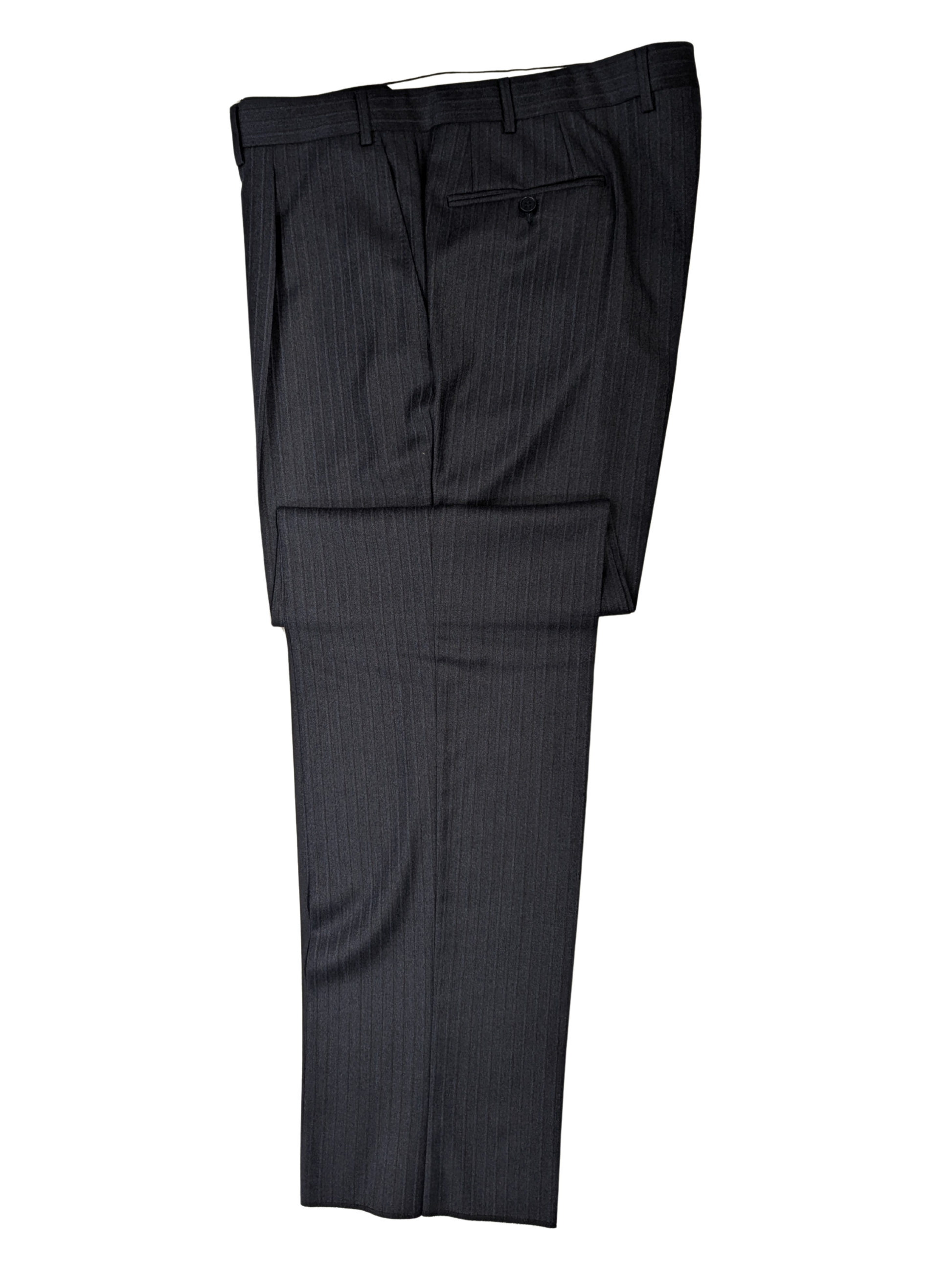 This Canali blue pinstripe suit blends classic tailoring with understated detail, featuring a refined mix of subtle maroon and white pinstripes that add depth and character to the rich blue base. Crafted from 100% pure wool with a light flannel finish, the fabric offers a soft hand and a slightly warmer weight, ideal for cooler seasons while remaining breathable. The jacket showcases a traditional 3-button closure, notch lapels, and lightly structured shoulders for a timeless silhouette. Dual side vents allow comfortable movement, and the matching trousers feature a classic pleated front, providing a more traditional drape and ease through the thigh. Fully lined and finished with Canali’s signature precision, this suit is a sophisticated choice for the gentleman who values both elegance and comfort in his formal wardrobe.