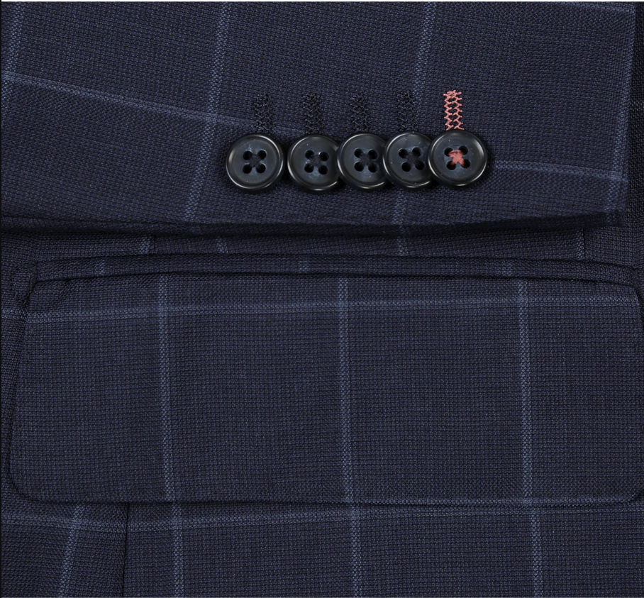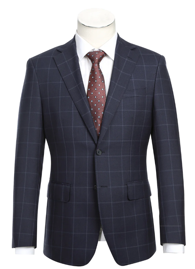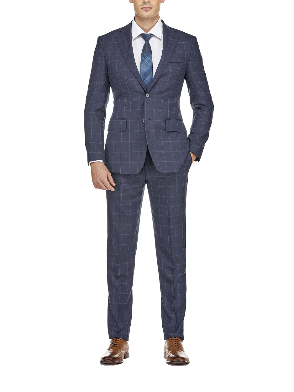 Looking for a finely tailored wool suit at an unbeatable value? You’ve found it. This English Laundry navy windowpane suit is crafted from a premium wool-polyester blend, delivering durability with a refined, comfortable feel. Cut in a modern slim fit, it features a classic notch lapel, two-button closure, flap pockets, and dual side vents for a structured yet breathable silhouette. Finished with a subtle windowpane pattern, this versatile suit is ideal for weddings, special occasions, or standout professional wear.