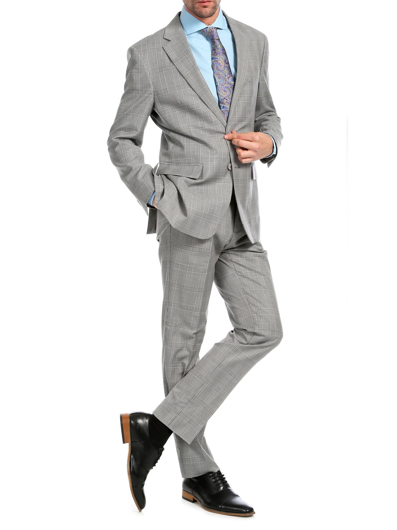 A finely made wool blend suit at a reasonable price? You found it. This classic fit gray plaid two button wool blend mens suit is made from luxury wool fabric that drapes superbly across the body. The classic fit is timeless – and comfortable. It’s the perfect suit for wedding parties and groomsmen, as well as for year-round business wear.
