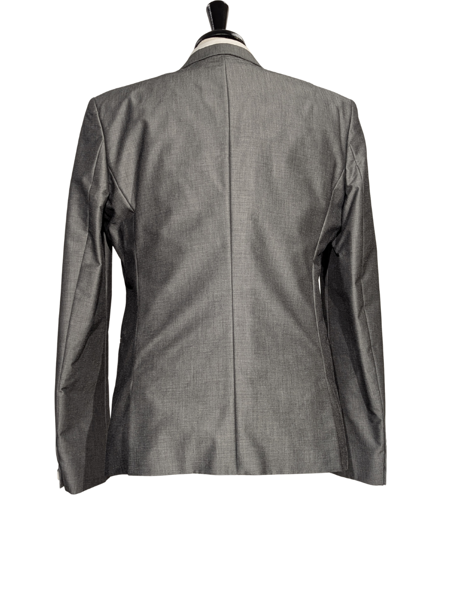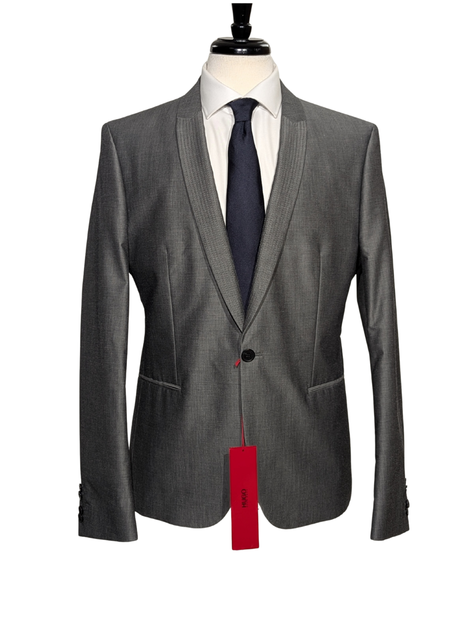 This Hugo Boss tuxedo combines contemporary design with a refined fabric blend of cotton and mohair, Tailored in a slim fit it delivers a smooth drape and a touch of natural luster. The textured gray fabric adds subtle depth, while shawl lapels and a single- front button create a timeless, tailored look. Ideal for business or formal occasions, it’s a refined wardrobe essential with modern appeal.