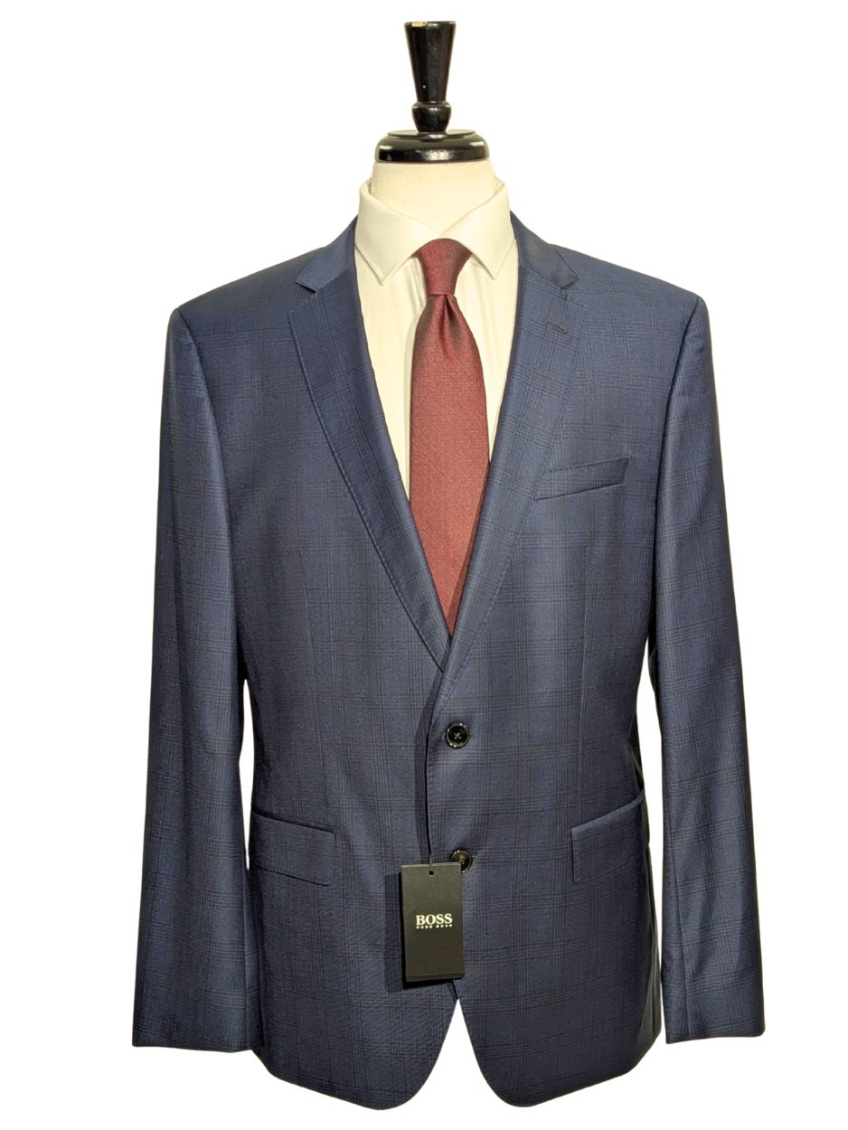Hugo Boss Super 120s Navy Blue Plaid Windowpane Slim Fit Notch Lapels Wool 2-Button Suit - 44R
