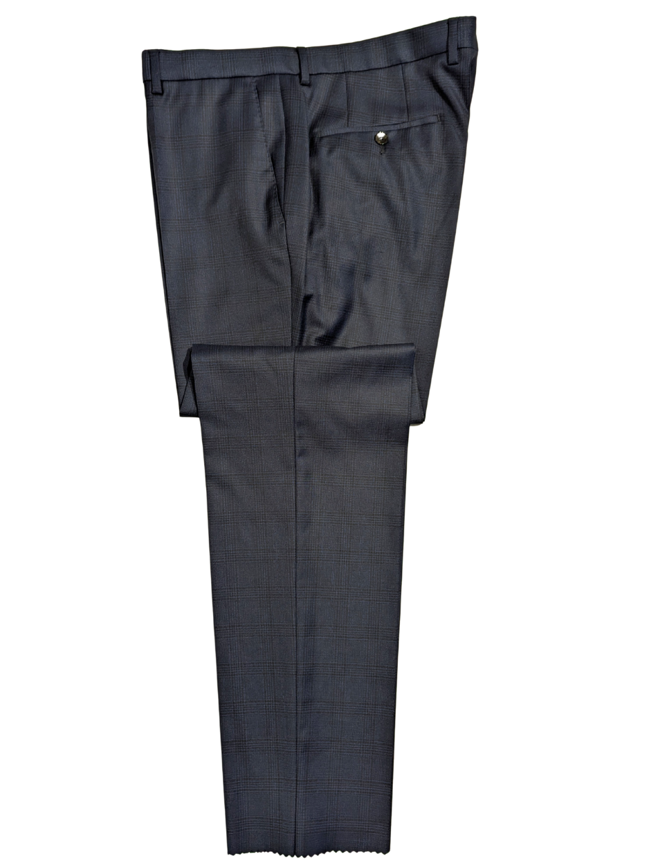 This Hugo Boss suit is crafted from luxurious Super 120s wool by Drago, offering a soft hand feel with excellent drape and durability. The plaid windowpane navy fabric adds subtle depth, while notch lapels and a 2-button front create a timeless, tailored look. Ideal for business or formal occasions, it’s a refined wardrobe essential with modern appeal.