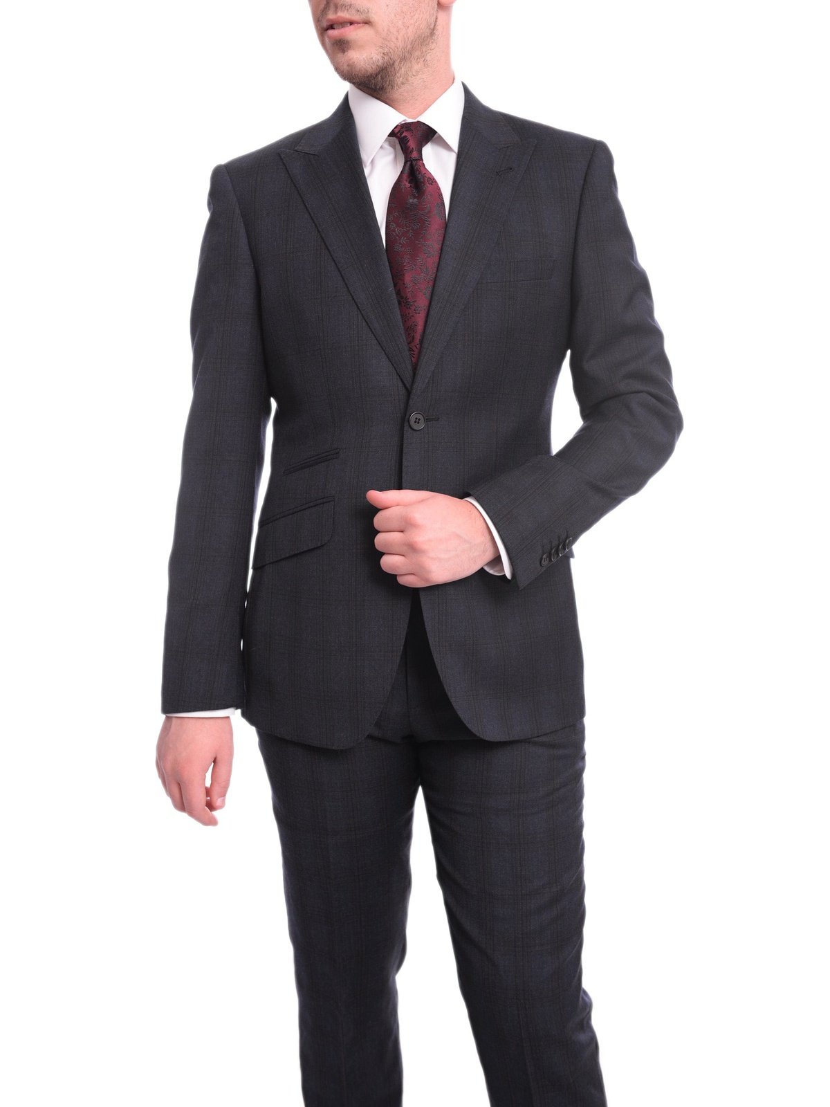 Ideal Slim Fit Blue And Red Plaid Two Button Wool Suit Peak Lapels