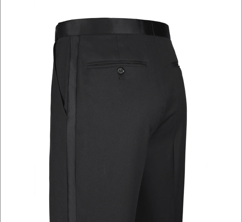 A busy social agenda requires a classic black tuxedo that'll always look sharp, and this Raphael tuxedo is faultlessly made for timeless elegance. This tuxedo is tailored from 100% wool with satin notch collar and has covered buttons for a final flourish. The flat front pants are trimmed with satin ribbon that runs down both legs, and the pants are left unhemmed to allow tailoring for your exact fit.