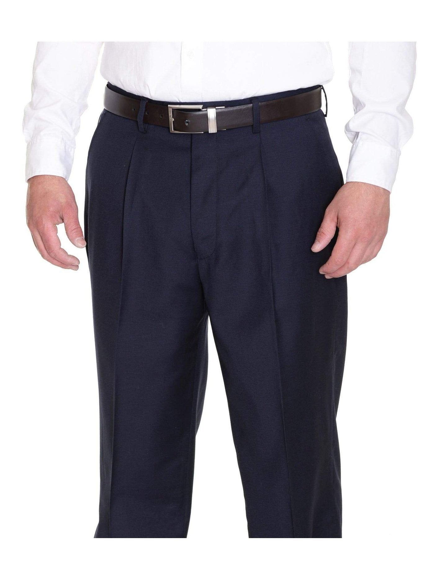 Mens Classic Fit Solid Navy Blue Pleated Wool Dress Pants