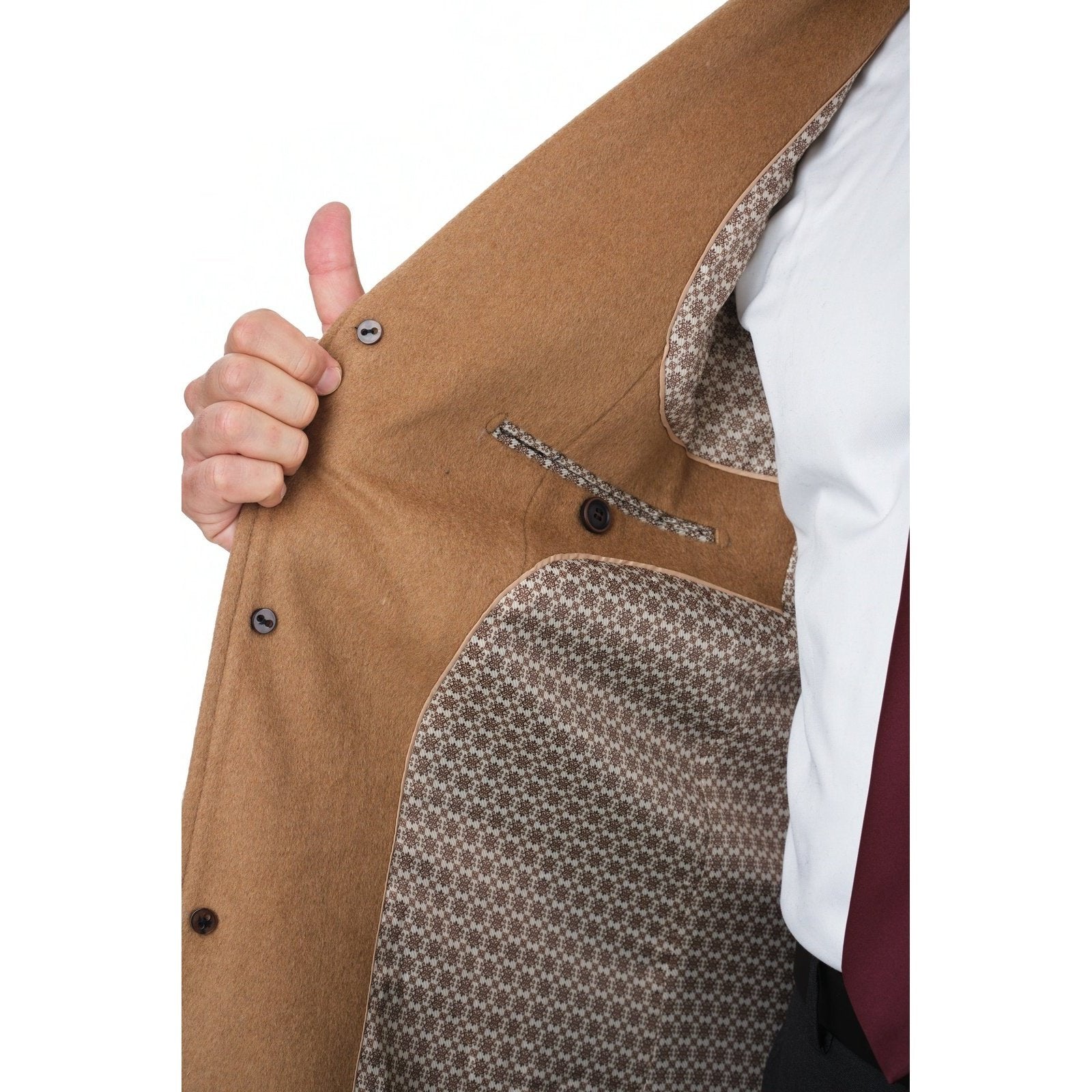 Mens Regular Fit Solid Camel Tan Full Length Wool Cashmere Overcoat Top Coat