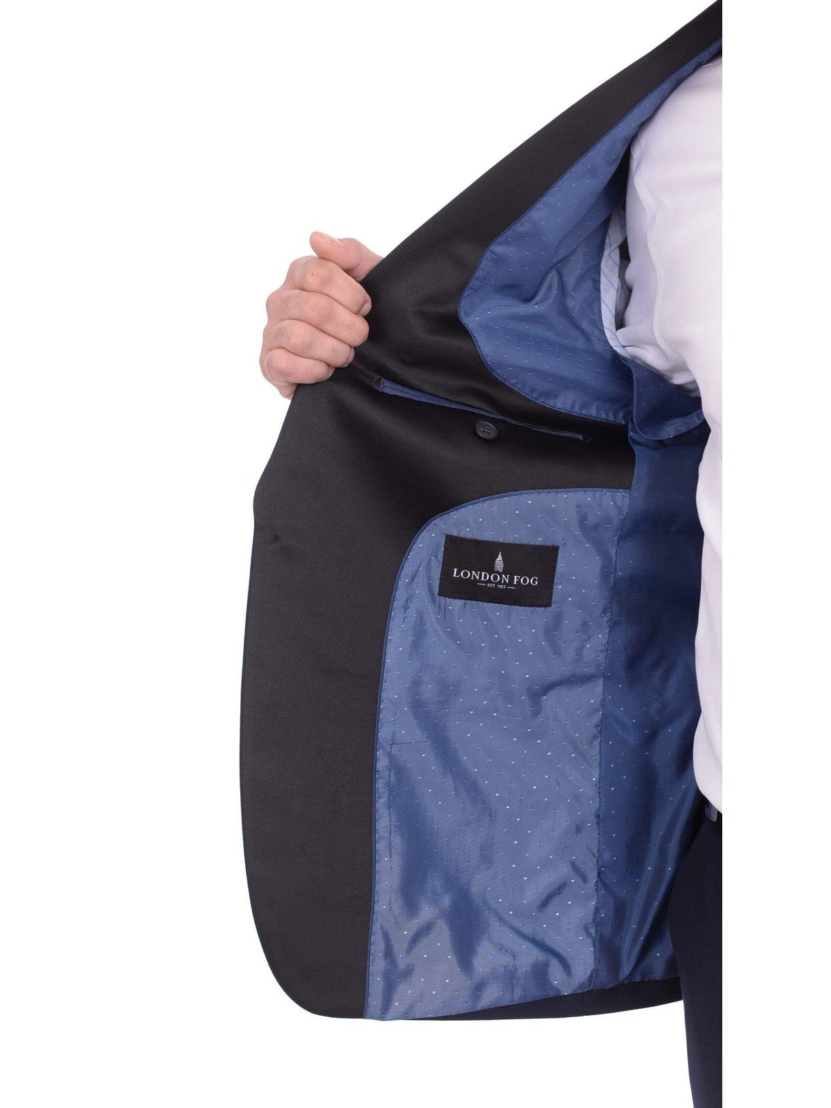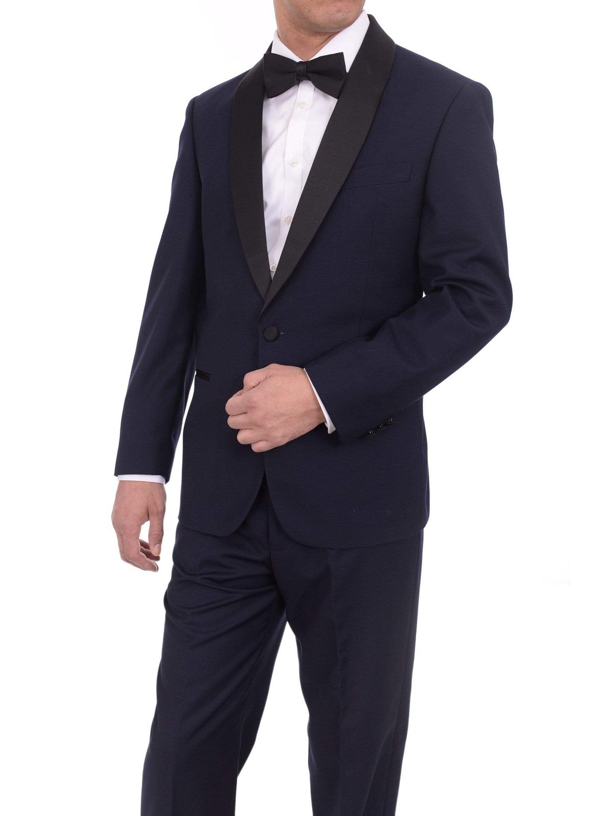 Mens Slim Fit Navy Blue One Button Tuxedo Suit With Black Satin Shawl Lapel
