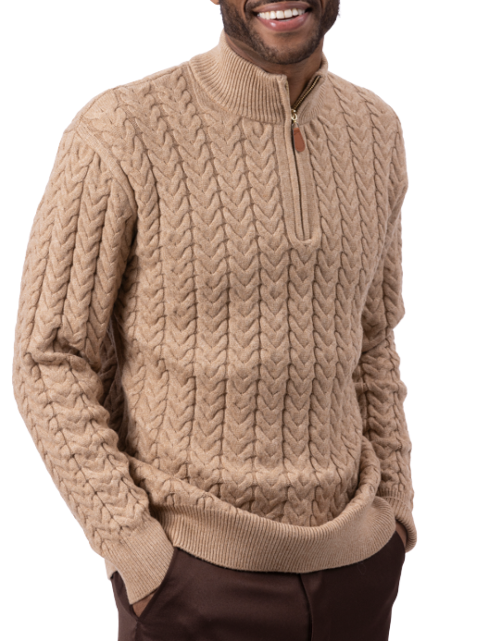 Montique Beige Chevron Cable Regular Fit Quarter Zip Cotton Knit Sweater