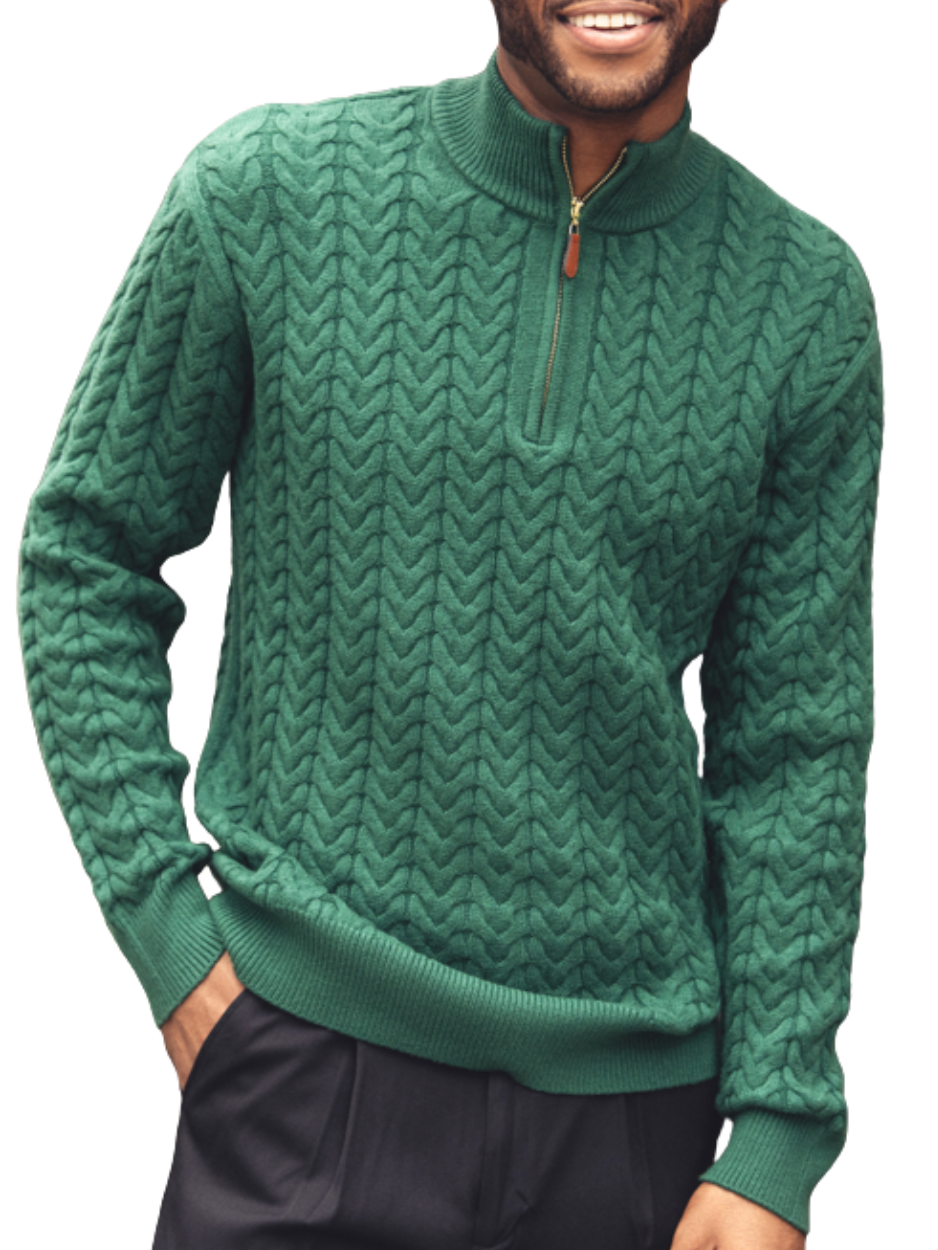 Montique Emerald Green Chevron Cable Regular Fit Quarter Zip Cotton Knit Sweater