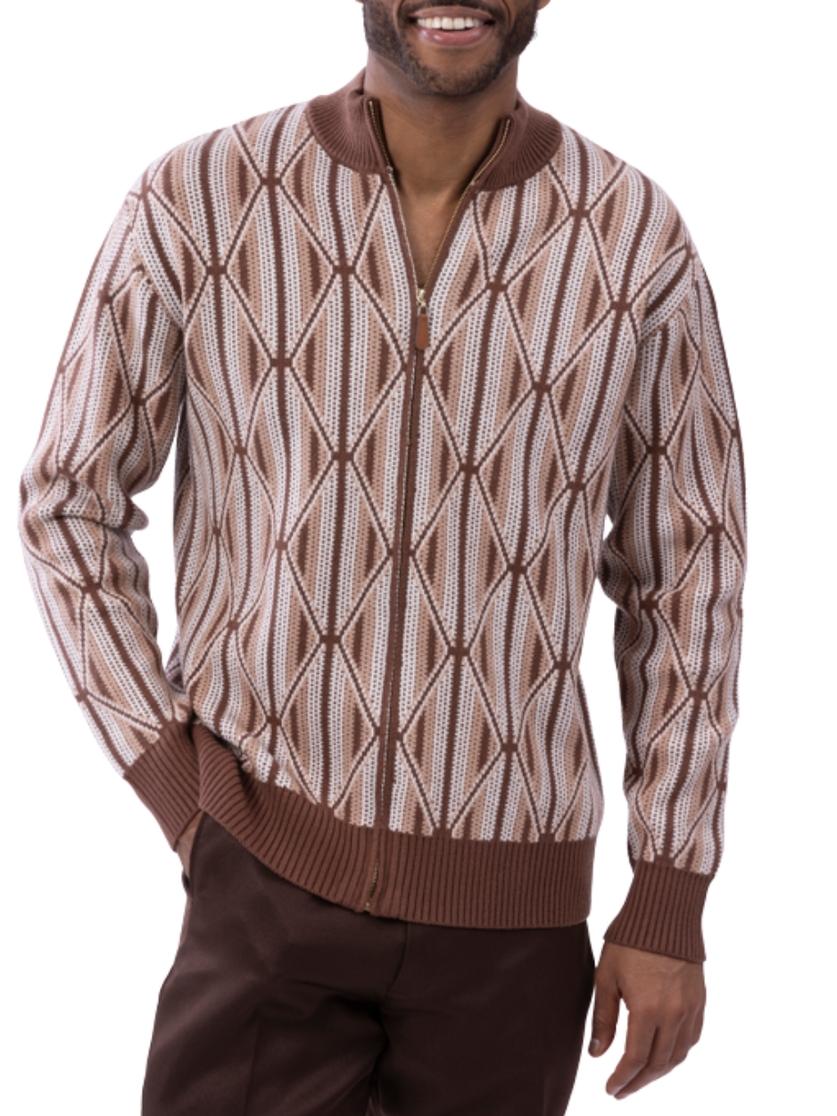 Montique Geometric Diamond Brown Beige Regular Fit Full Zip Cotton Knit Sweater
