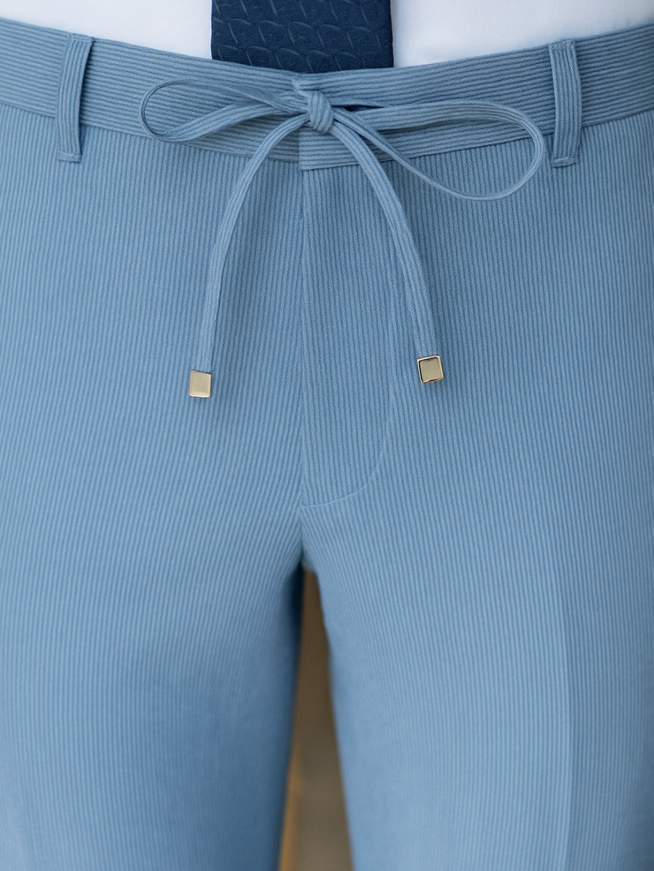 Pierre Carlos Pinstriped Light Blue Slim Fit Stretch Linen Suit with Drawstring Waist