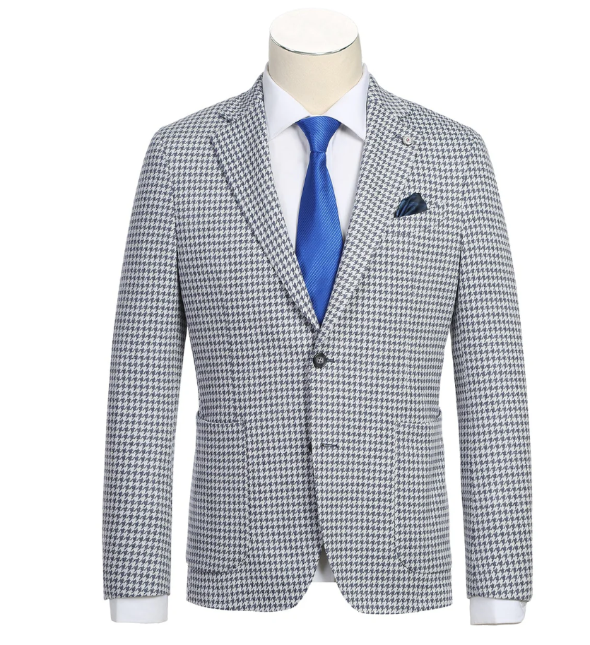 This blue and white houndstooth blazer blends a crisp, eye-catching pattern with refined tailoring. Made from lightweight fabric, it offers comfort without sacrificing structure. The two-button front, notch lapels, and patch pockets create a polished yet versatile style that pairs effortlessly with dress trousers or chinos for both professional and social settings.