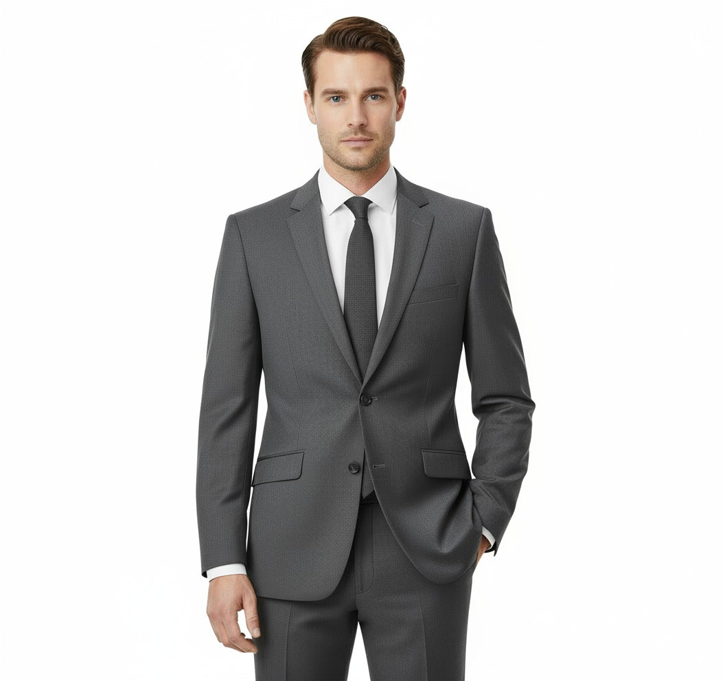 Achieve a refined, contemporary look with this slim fit charcoal gray suit, tailored for a sharp, modern silhouette. The two-button, single-breasted jacket features notch lapels, flap pockets, and side vents for both style and comfort. Matching slim-cut, flat-front trousers complete the sleek profile, making this suit an ideal choice for business, weddings, and formal events. The versatile charcoal shade pairs seamlessly with a wide range of shirt and tie combinations, offering a timeless yet modern wardrobe staple.