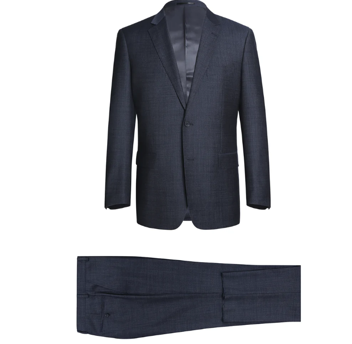 This classic fit navy suit is crafted from a smooth, subtly textured fabric that delivers a polished, versatile look. Designed with a notch lapel, two-button closure, and flap pockets, it offers a timeless silhouette that works for business, weddings, and formal events. The matching flat-front trousers ensure a cohesive, professional appearance while maintaining comfort throughout the day.