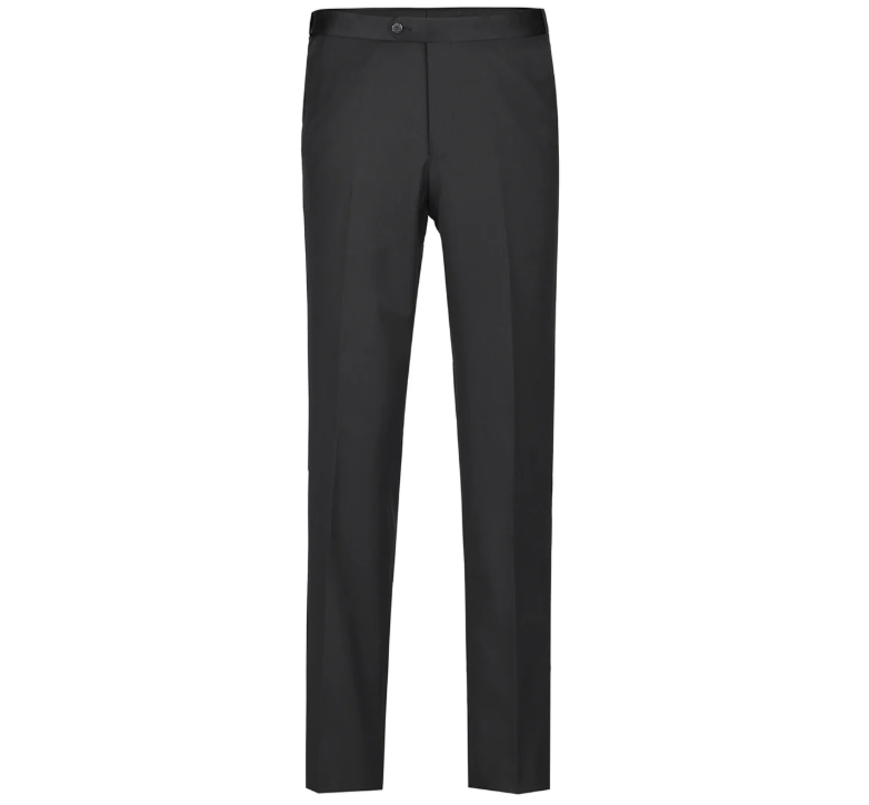 A busy social agenda requires a classic black tuxedo that'll always look sharp, and this Raphael tuxedo is faultlessly made for timeless elegance. This tuxedo is tailored from a polyester blend with satin peak lapels and has covered buttons for a final flourish. The flat front pants are trimmed with satin ribbon that runs down both legs, and the pants are left unhemmed to allow tailoring for your exact fit.